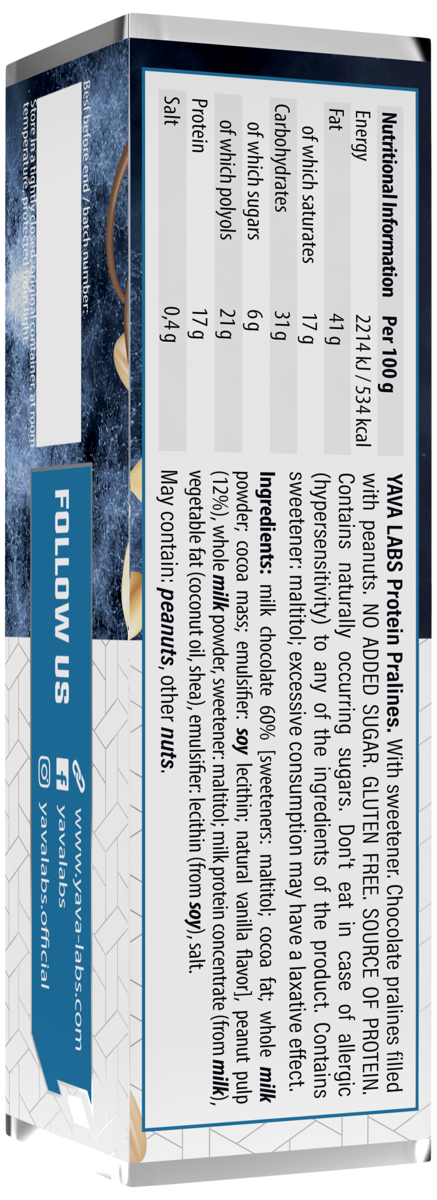 Die Proteinpralinen von YAVA LABS enthalten natürlich vorkommende Kohlenhydrate, die vom Körper produziert werden. Das Produkt sollte nicht bei Allergien oder Überempfindlichkeiten gegenüber einem der Inhaltsstoffe konsumiert werden, da dies den Gesundheitszustand verschlechtern könnte. Es enthält den künstlichen Süßstoff Maltitol, der, wie gezeigt, eine abführende Wirkung hat, wenn er in ausreichenden Mengen konsumiert wird.
